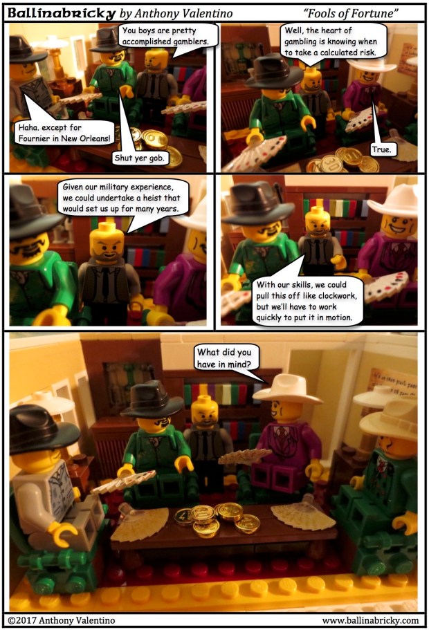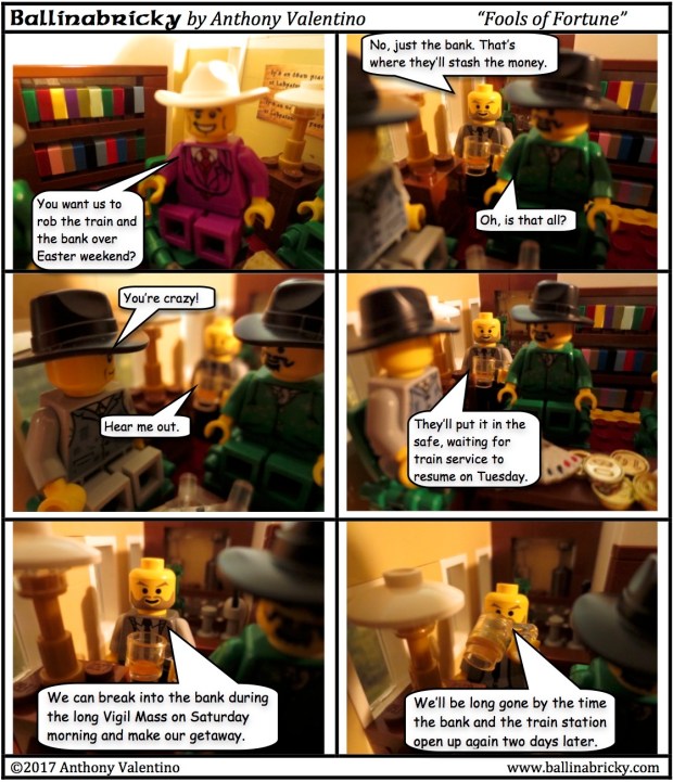Well, at this point, if you are a classic movie buff, you may have noticed some elements of this plan and plot that seem vaguely familiar. The whole story was a bit of an homage to Ocean’s 11 (the original one). “Donaill Muir” could be translated as “Danny Ocean,” Frank Sinatra’s character, and Jimmy Foster was the name of Peter Lawford’s character. The idea of the multi-site heist made more likely through military training and the heart attack/money-in-the-coffin/cremation were elements inspired by the film.