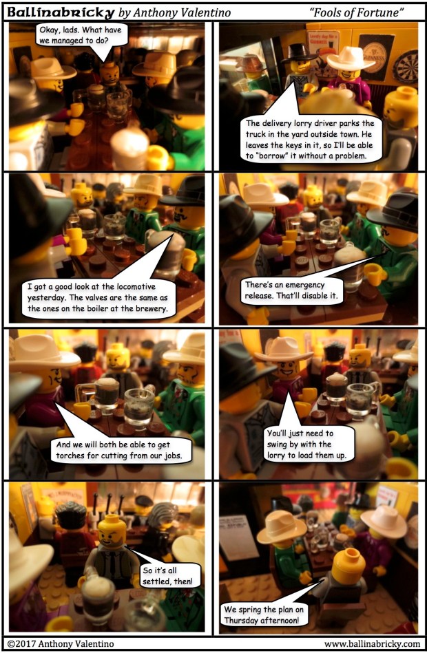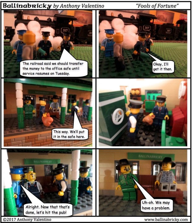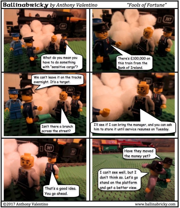 Because of that, Bee and Fournier would have met the coffin on the morning train as it was going from Ballinabricky to Dublin. There would presumably be some meeting with the authorities to hand over the coffin (which was expected to stay in town with Joe Foster), causing them to miss the train when it pulled out of the station headed for Dublin a few minutes later. It seems, however, that Bee and Fournier got on the train after it turned around in Dublin and was heading back to Cork. That was not the plan, as they were supposed to stay in Kildare until the train had gone all the way back to Cork, turned around, picked up Hoyle and Tally on its way back to Dublin, and then got on it with the money (no need to actually travel with the coffin) and all met up in the city.