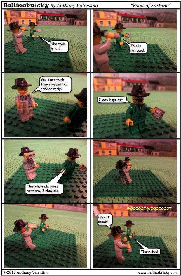 Shots like the double-wide in the middle can be difficult to shoot without breaking the fourth wall. I have designed a museum for the space across the street from the bank and the diner, but I haven’t purchased the parts and built it yet (even though it’s technically supposed to be there already — I made reference to it as far back as Dani’s lecture in The Dead). It would be the biggest, most detailed building in the town. Maybe I should run a GoFundMe…