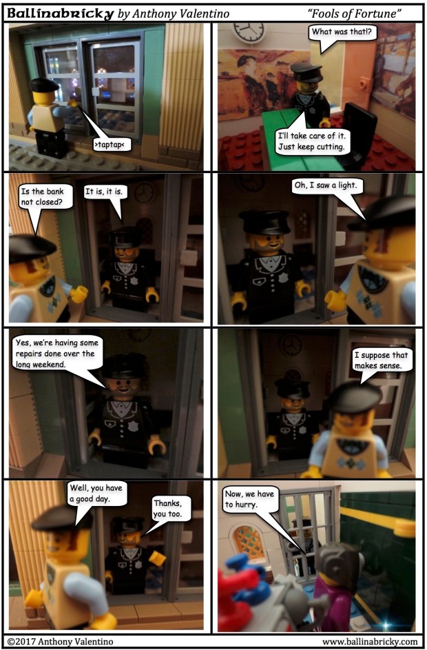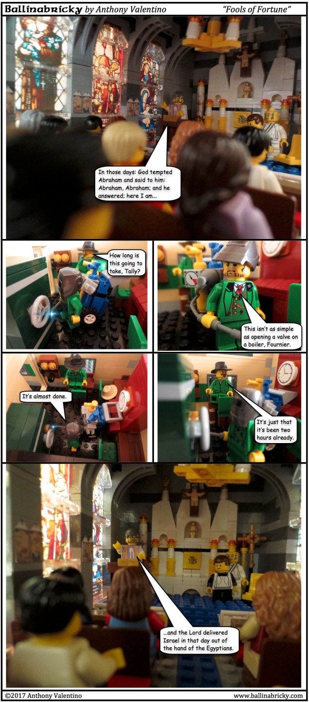 There will be scenes from the Mass juxtaposed against the scenes of the heist. I’ve done this both to give a sense of the time passing as well as to add meaning to the events in the story. Those of you who are historically minded may be interested to know that I actually went to the trouble of purchasing an old missal from 1936, so the way I depict the various parts of the Mass here are accurate representations of what is called for in the missal.
