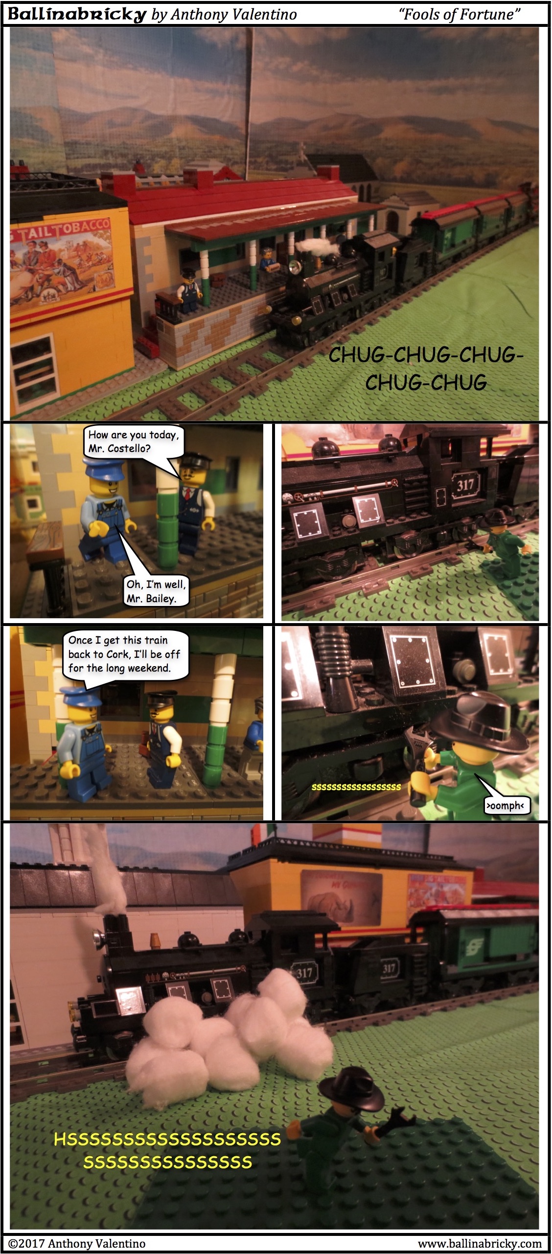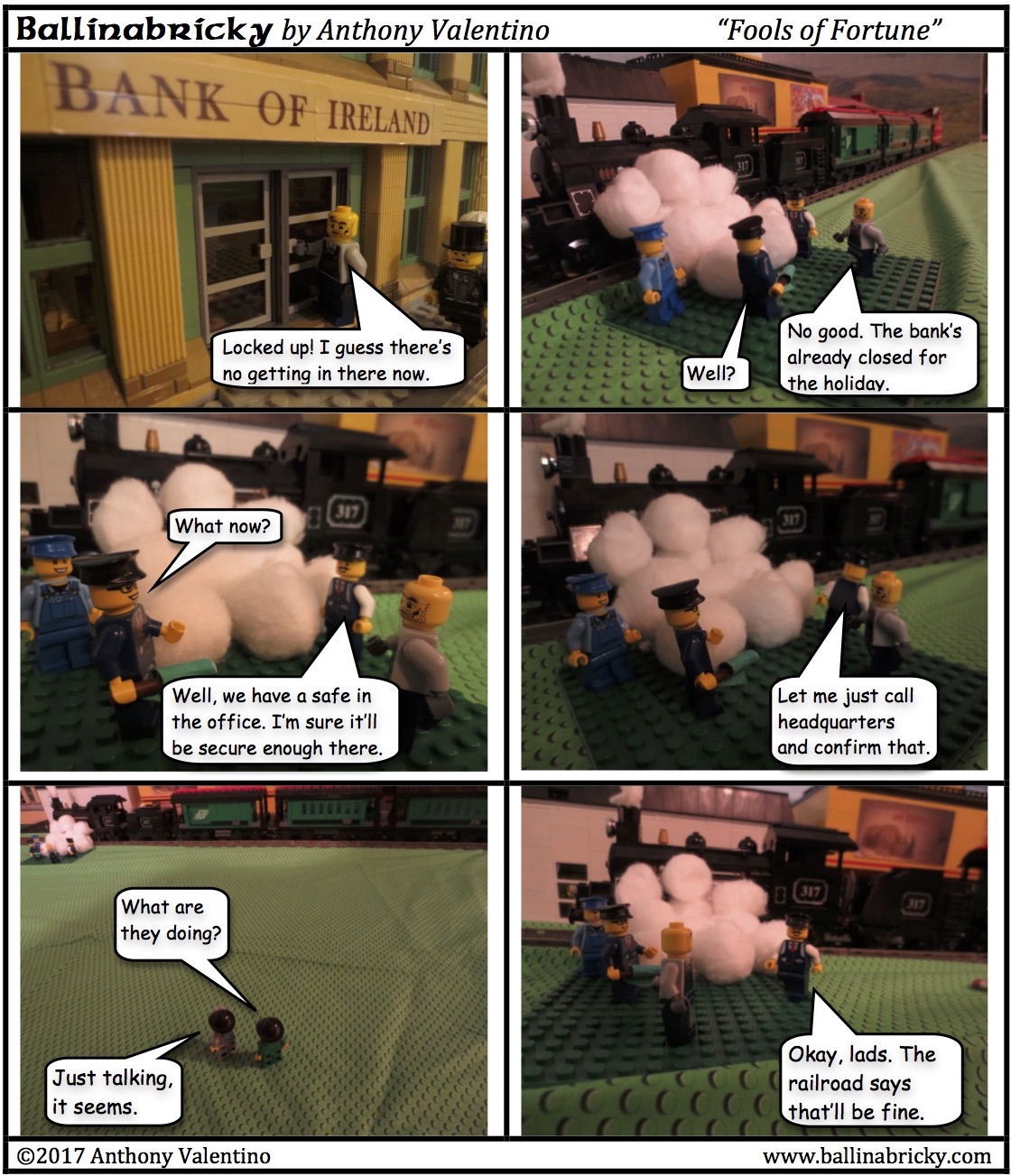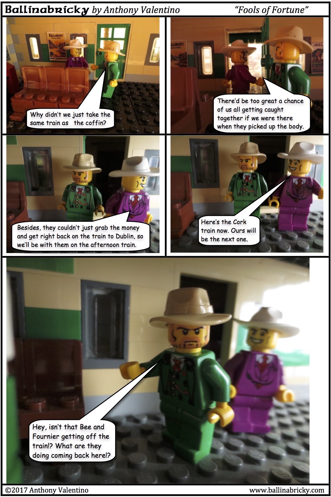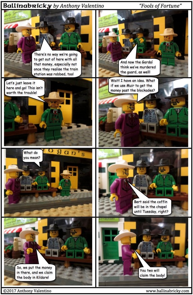 Because of that, Bee and Fournier would have met the coffin on the morning train as it was going from Ballinabricky to Dublin. There would presumably be some meeting with the authorities to hand over the coffin (which was expected to stay in town with Joe Foster), causing them to miss the train when it pulled out of the station headed for Dublin a few minutes later. It seems, however, that Bee and Fournier got on the train after it turned around in Dublin and was heading back to Cork. That was not the plan, as they were supposed to stay in Kildare until the train had gone all the way back to Cork, turned around, picked up Hoyle and Tally on its way back to Dublin, and then got on it with the money (no need to actually travel with the coffin) and all met up in the city.
