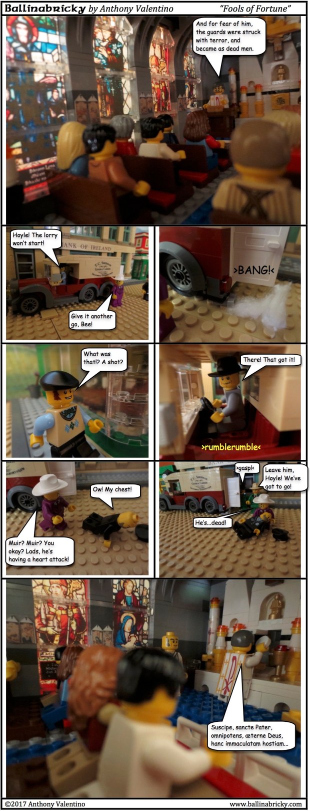 There will be scenes from the Mass juxtaposed against the scenes of the heist. I’ve done this both to give a sense of the time passing as well as to add meaning to the events in the story. Those of you who are historically minded may be interested to know that I actually went to the trouble of purchasing an old missal from 1936, so the way I depict the various parts of the Mass here are accurate representations of what is called for in the missal.